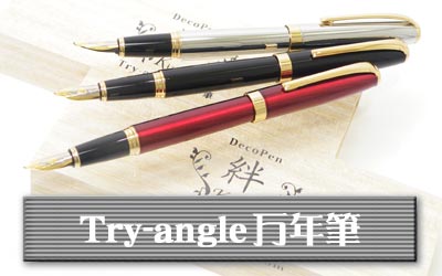 | 「トライアングル万年筆」の万年筆は持つ角度や筆圧を変えることによって、文字の太さが自由自在に調整できると、今巷で人気の商品です。 |