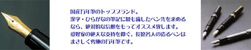 明治44年創業のセーラー万年筆が代表作として誇る万年筆「PROFIT」は、長い歴史の中で培ってきた技術と感性を凝縮して作り上げ、1978年に発売されました。「PROFIT]は、技術的にもデザイン的にも改良の余地のない、完成されたスタンダードと絶賛されています。奇をてらわないオーソドックスな流線型のボディは、絶妙のバランス感。手にする人に親しみと安心感を与えるとの、高い評価を頂いています。ステータス性も高い21Kペン先は、弾力性に富み、これぞ万年筆というしなやかな感触と滑らかな書き味をもたらします。 ペン先とのバランスを考えて作られた軸は、リラックスして筆記するのに適した太さになっていて、ペンの重心はキャップを尾部にはめるか外すかで調節して頂けます。 セーラーPROFITシリーズの顔ともいえる1本です。 いかにも万年筆といったイメージの大きめのボディ。しかしながら、グリップ部は、10〜12mmの円すい状で、決して太過ぎず、軽やかな書き味を作り出します。大きめのボディは、力が抜けやすいので、ヘビーユーザーにもお勧め。デスクワークに最適のタイプです。 |
